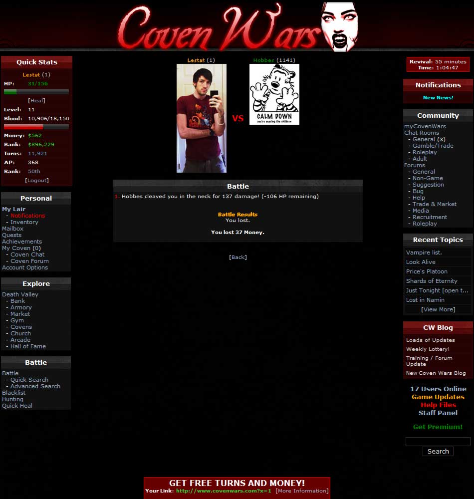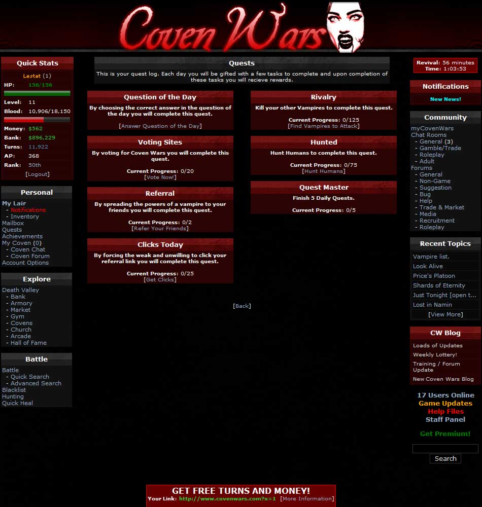 Vampire Genesis is one of the original free vampire games still thriving online. These wars began long ago, in the dark ages of the Vampire Crusades. The fires burn strong, even after all these years. Once you join this free vampire MMORPG, you will learn what it takes to be a vampire — skills, quests, dark magik, the hunt — all on your way to becoming one of the greatest vampires in Death Valley. No download required; play instantly in your browser. Do you have what it takes?
